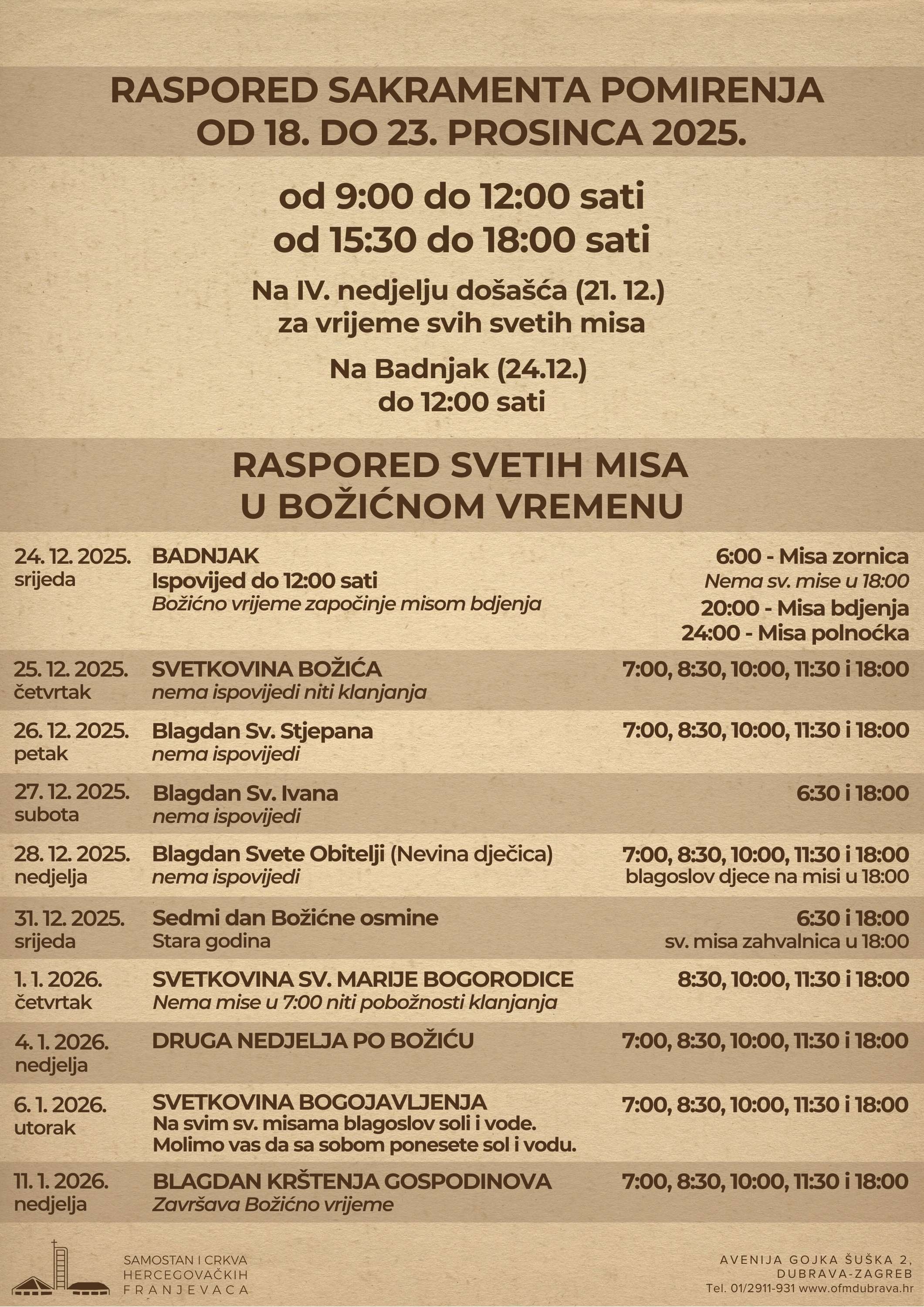 RASPORED ISPOVIJEDI I SVETIH MISA U BOŽIĆNOM VREMENU: