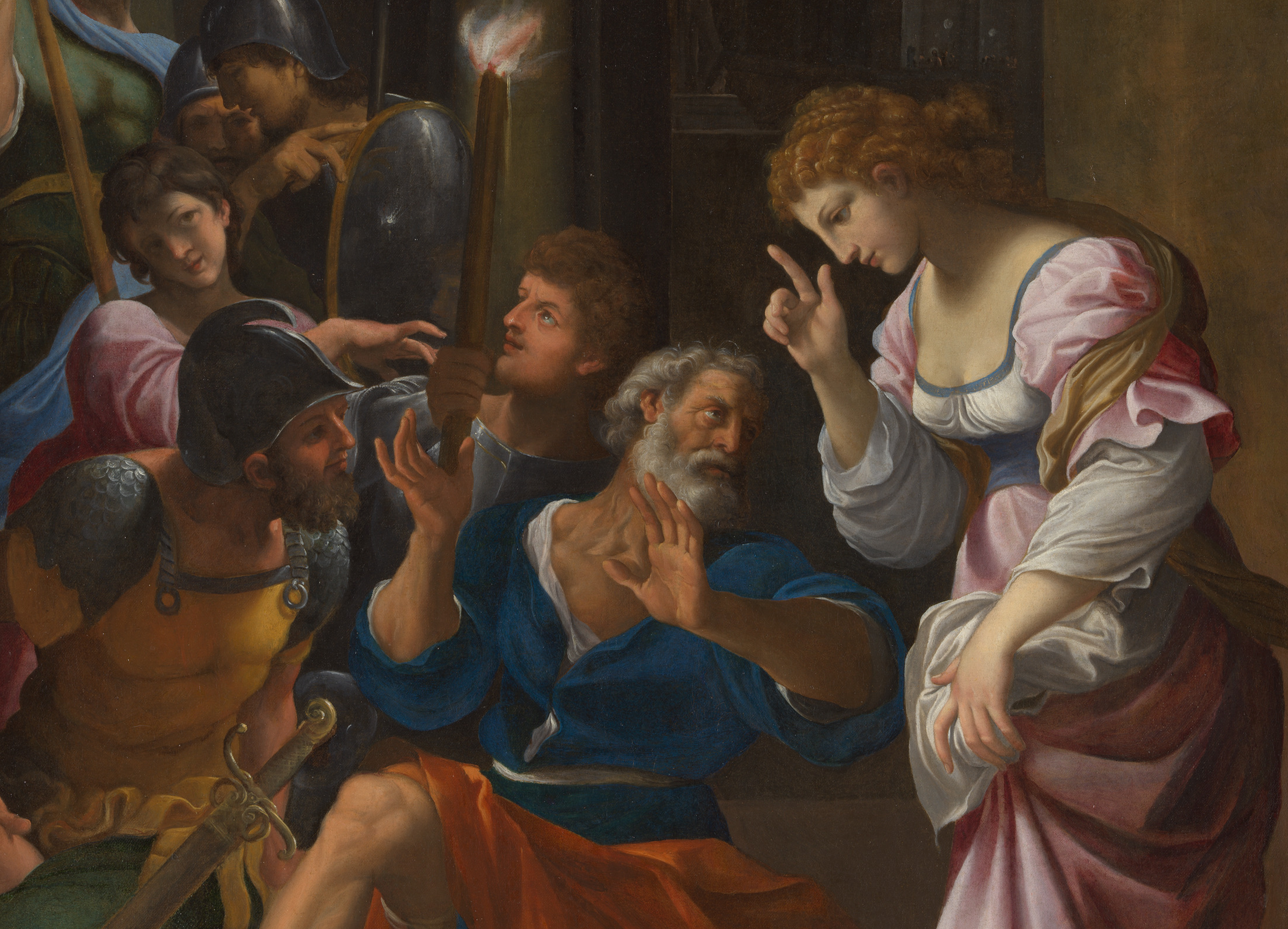 Nato uhvatiše Isusa i odvedoše ga velikomu svećeniku Kajfi, kod kojega se sabraše pismoznanci i starješine. A Petar je išao za njim izdaleka do dvora velikog svećenika; i ušavši unutra, sjedne sa stražarima da vidi svršetak.